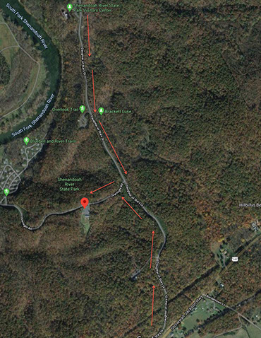 Shenandoah River State Park - Horse Trailer We meet in the horse trailer parking lot. GPS Coordinates: 38.847733, -78.306399 Physical Address: 350 Daughter of Stars Drive, Bentonville, VA 22610 Note: This address is for the Visitor Center. To reach the Horse Trailer parking lot, go (back) South on Daughter of Stars Drive ~0.8 miles and turn right on Overnight Rd ~0.2 miles. Turn left into the parking lot. Driving Directions: From the D.C. Beltway (I-495): Head southwest on I-66 W (50.8 miles). Take exit 13 toward VA-79/VA-55/Linden/Front Royal (0.2 miles). Turn left onto VA-79 S (0.2 miles). Turn right onto VA-55 W (4.7 miles). Turn left onto Remount Rd (0.4 miles). Turn right onto E Criser Rd (0.7 miles). Turn left onto US-340 S (7.9 miles). Turn right onto Daughter of Stars Dr (0.7 miles). Turn left onto Overnight Rd (0.2 miles). Turn left into parking lot. From Hagerstown, MD (I-70 and I-81):
